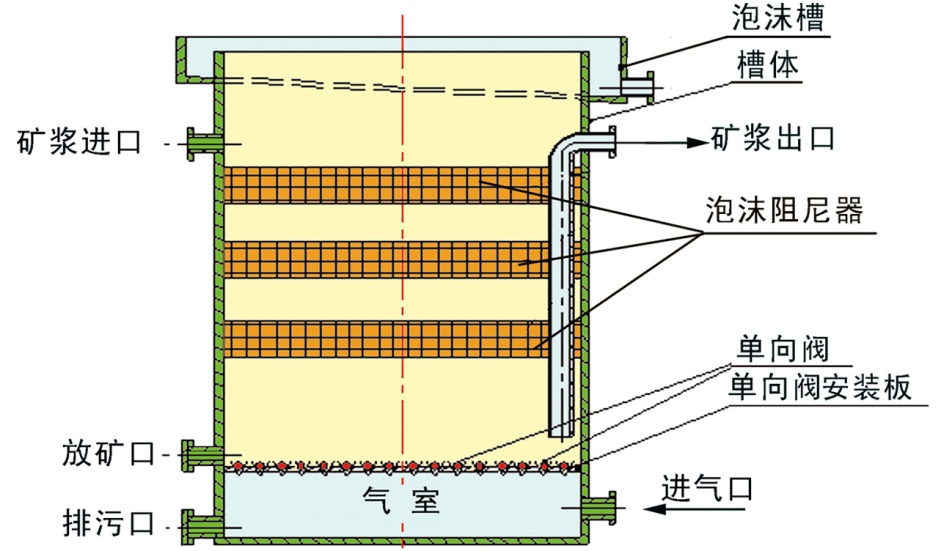 全截面氣升式微泡浮選機(jī)是一種在浮選機(jī)底部全截面均勻地密布安裝眾多彈性耐磨橡膠單向閥,單向閥閥孔較小,當(dāng)壓入空氣是,產(chǎn)生大量的微泡。浮選機(jī)槽體較高,槽內(nèi)設(shè)有礦漿阻尼裝置,延長(zhǎng)了浮選時(shí)間和增加了礦粒、藥劑和空氣的附著機(jī)會(huì),減少了小氣泡的團(tuán)聚。同時(shí)因?yàn)榇罅繋в袎毫Φ臍馍諝鈱?duì)礦漿起到了攪拌作用,所以浮選機(jī)的攪拌不需要另外的電動(dòng)攪拌裝置,節(jié)能效果非常明顯。